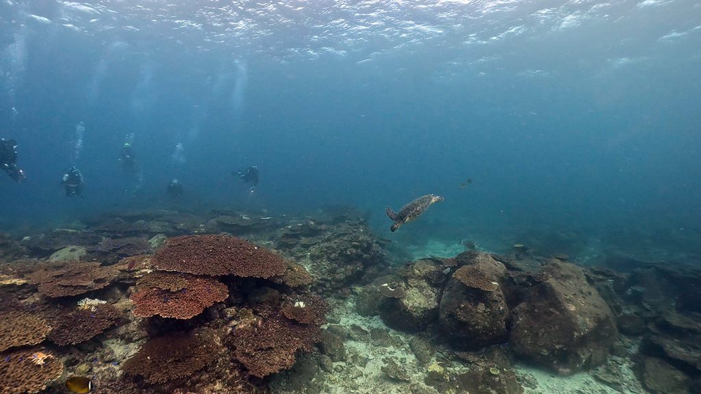寝床に帰るアオウミガメ。 沖縄で見る光景と似てます♪