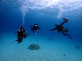 ファンダイビングチームと体験ダイビングチームに分かれて、万座の海を満喫。