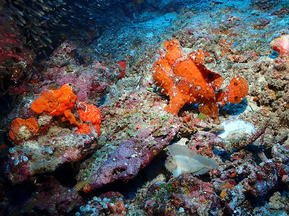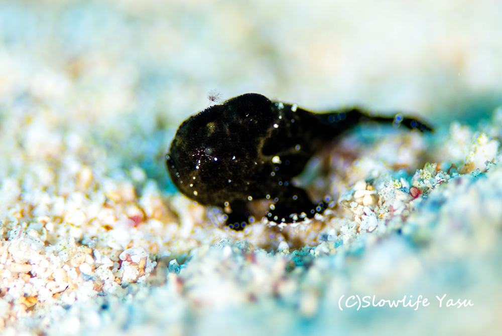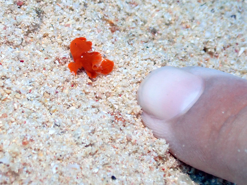 1本目は砂地からスタート♪ 小さなオレンジのカエルアンコウ幼魚。 サイズ感は僕の人差し指と比べるとわかりやすいです(^^♪