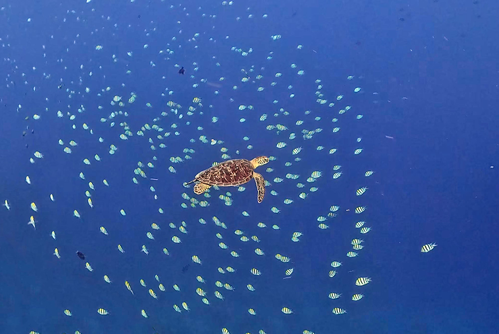 オヤビッチャの群れと一緒に泳いでいたアオウミガメ♪