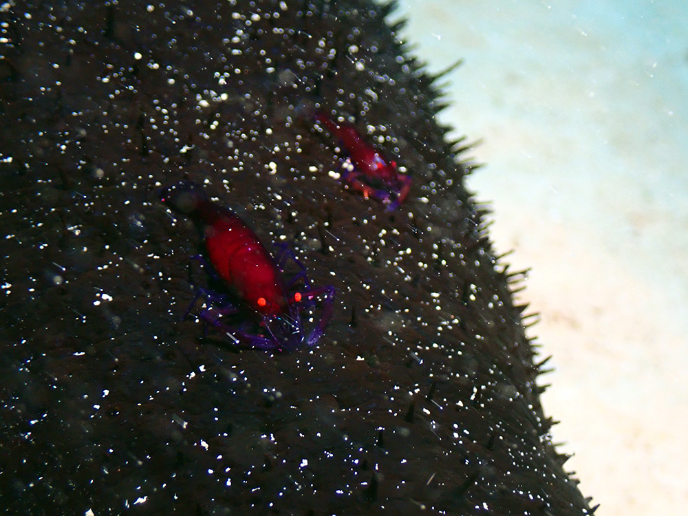 クロナマコに付いている、ウミウシカクレエビ(カラーバリエーション)ブラックデビルバージョンと勝手に呼んでいる(笑)
